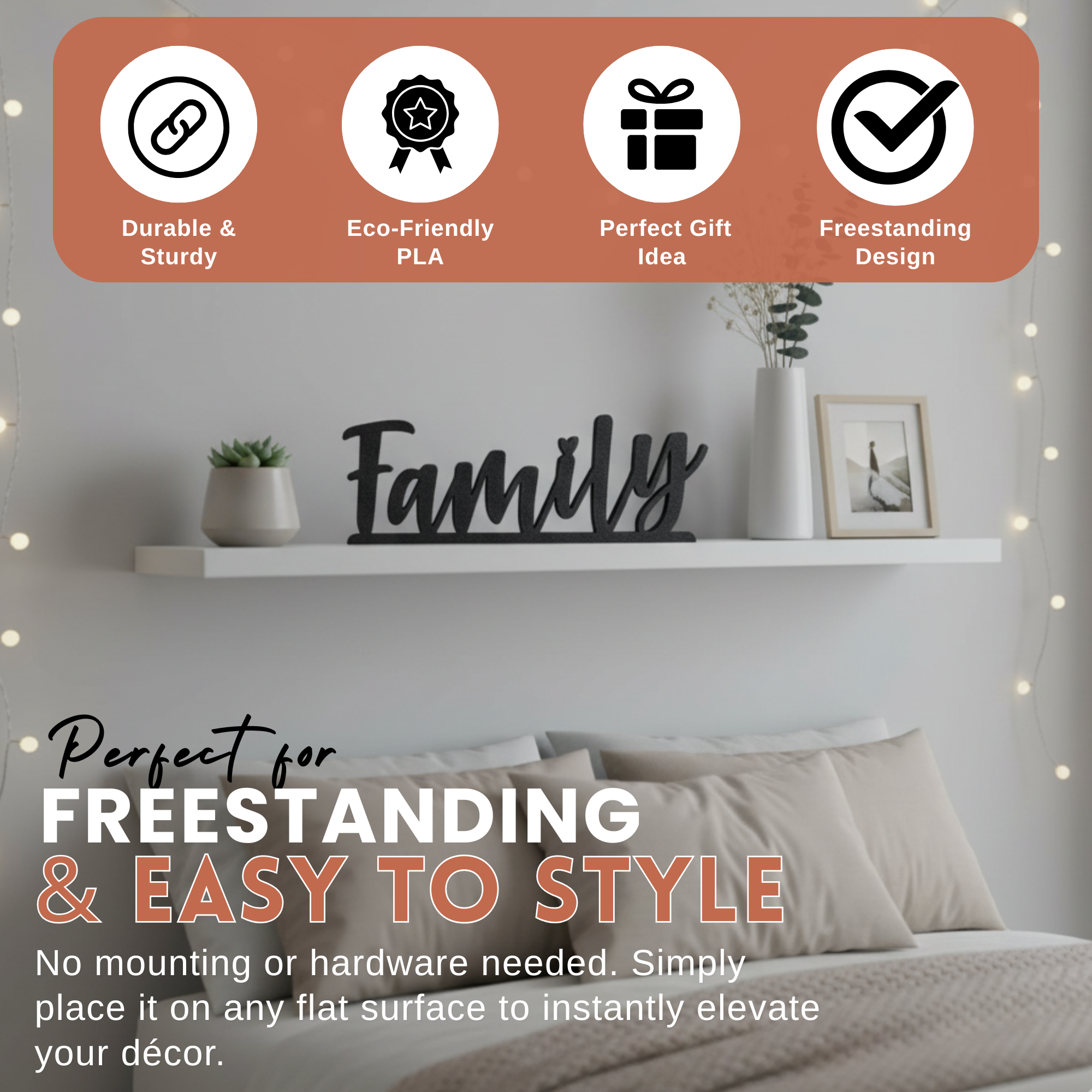 Bring warmth and meaning to your home with this Family Freestanding Sign, a timeless tabletop accent that celebrates togetherness and love. Crafted from eco-friendly PLA plastic with a premium textured finish, this lightweight yet sturdy piece complements any interior style — from modern minimalist to cozy rustic.